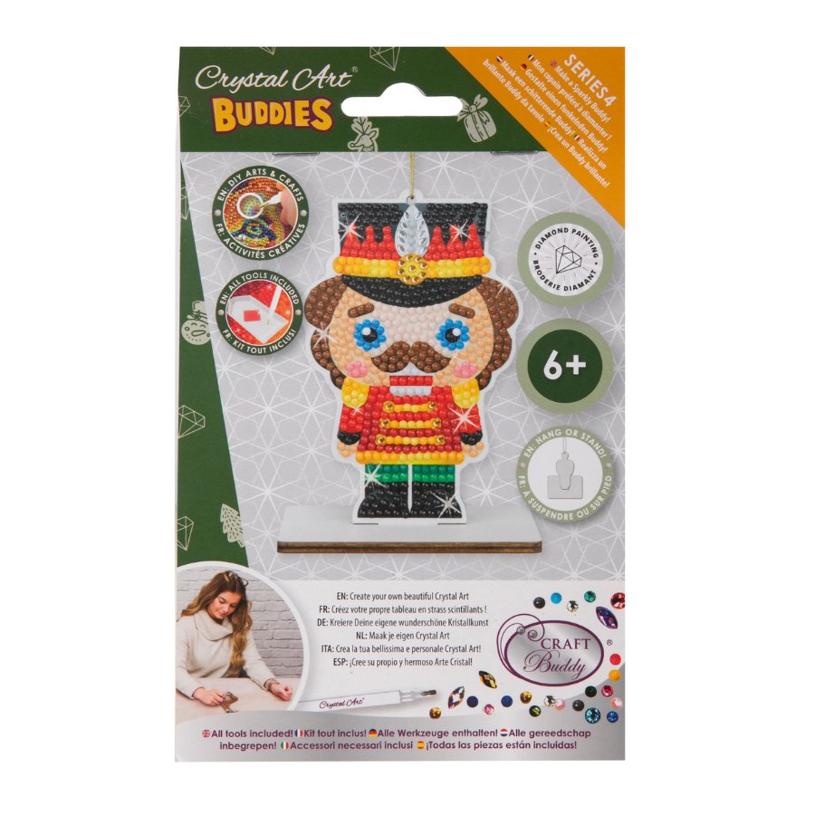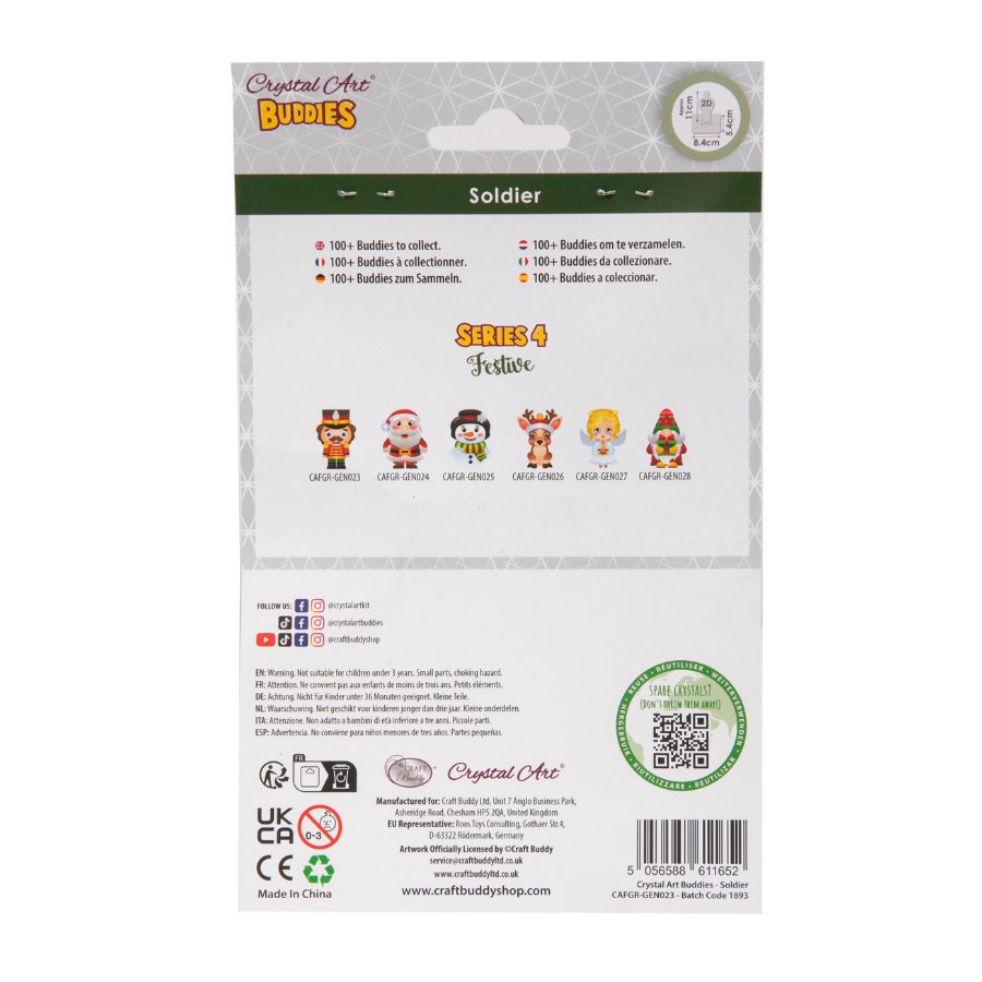 It's what you have been waiting for - the ‘Festive’ Series 4 of this popular craft kit! The Craft Buddy new range of their namesake ‘Buddies’ Crystal Art® Kit has a seasonal touch that will delight all the family. There are six to collect in this new range - Snowman, Santa, Angel, Gnome, Reindeer, and this charming 'Soldier'. The cute MDF DIY Crystal Art® Kits contain all you need to create a little Buddy character that can either be hung from your tree, or placed in its stand for a table or desk.