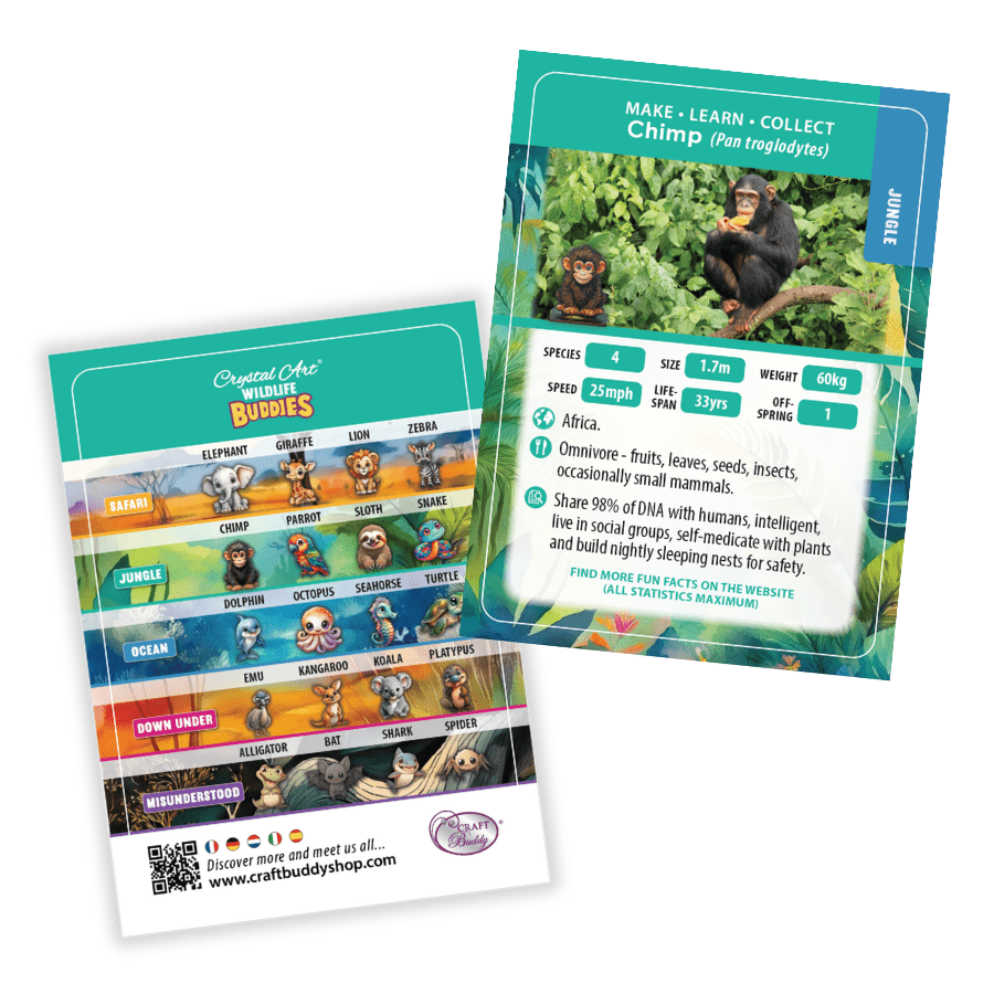 New for 2025, Craft Buddy brings you the collectable Crystal Art® Wildlife Buddies series. Featuring 20 original animal designs, each Crystal Creature has been given the diamond painting treatment, with fur, fins, tentacles and tails that will sparkle and shine. The new 'Series 5' range is made to be collected, whether you choose your favourite species or habitat. Why not go on a trek across wild deserts or swim the deep blue sea and collect the entire range!