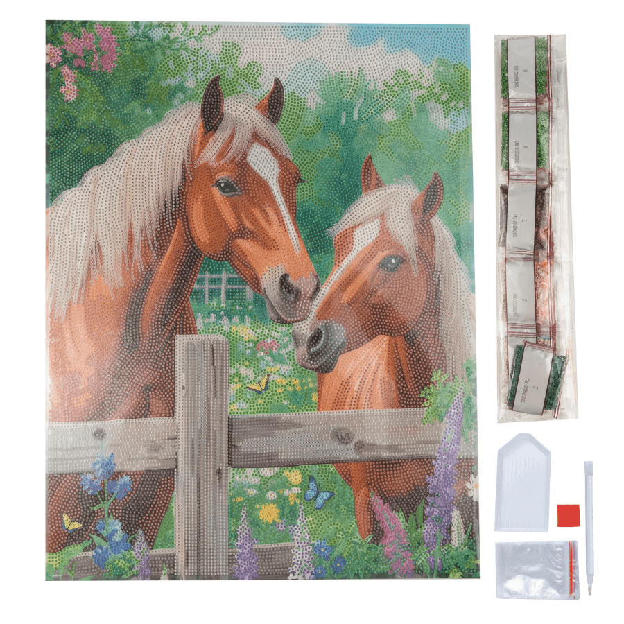 Bring a touch of the summer countryside into your home with the ‘Golden Mares’ Crystal Art® Canvas Kit from Craft Buddy. This gentle pair of mares - young and old - stand peacefully by a rustic fence, creating a beautifully calm and heartwarming scene. Perfect for horse lovers, this design transforms any space into a tranquil haven. This 40 x 50cm kit includes everything you need to create a dazzling full-crystal masterpiece, including a pre-stretched adhesive canvas, sparkling resin crystals, and all essential tools. Enjoy a relaxing and rewarding crafting experience as you bring this stunning design to life.