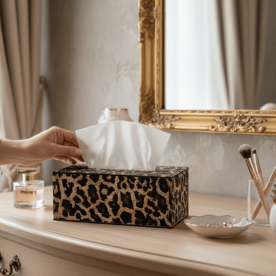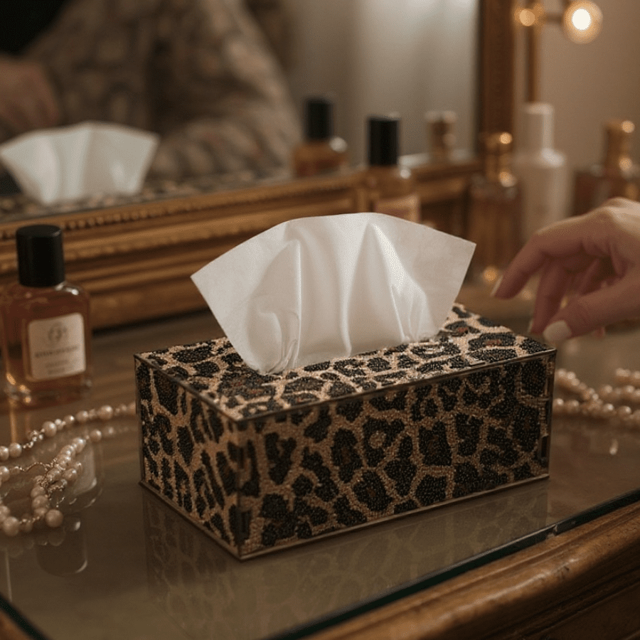 Introducing our Leopard Crystal Art Tissue Box - a luxurious and stylish addition to your home or office space. This exquisite tissue box combines functionality with artistic flair, providing a unique way to enhance your surroundings. Perfect for your bedroom to add that element of 'bling' to an everyday household product, this kit is also great for gifting to a house-proud pal!