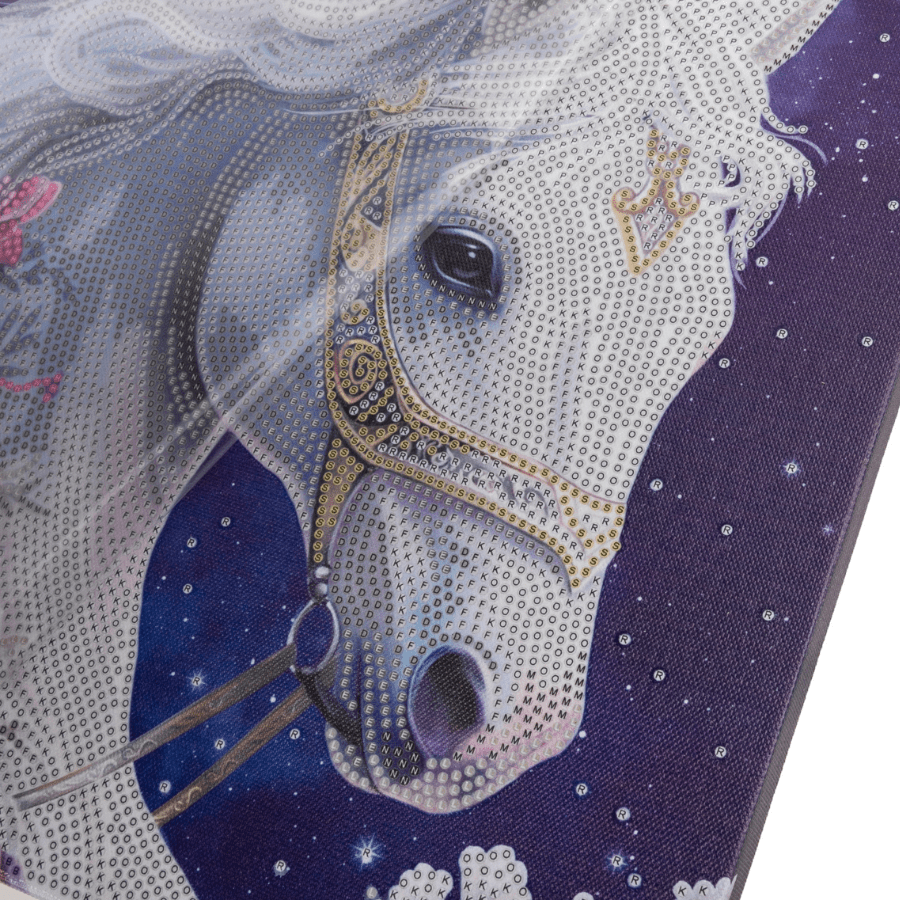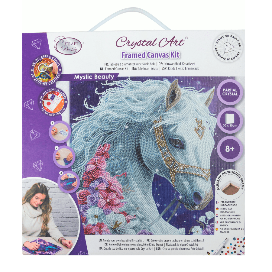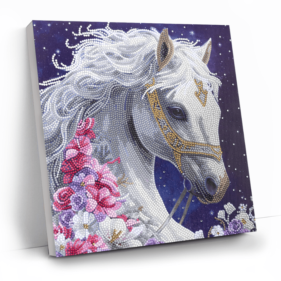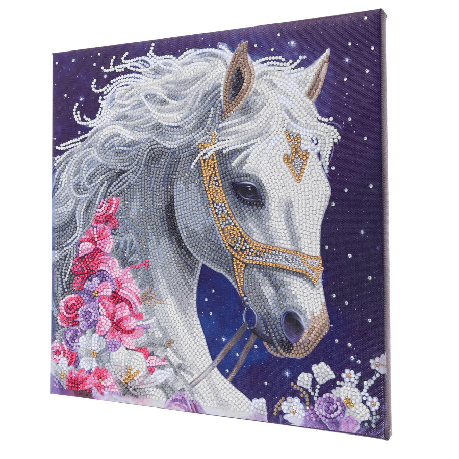 This stunning horse has been given the 'ethereal' treatment, with glimmering diamonds! The Craft Buddy 'Mystic Beauty’ 30x30cm Crystal Art® Canvas Kit features a gentle creature in white and silver sparkle. Surrounded by contrasting pastel flowers, it will make a peaceful yet striking piece of art for your space.